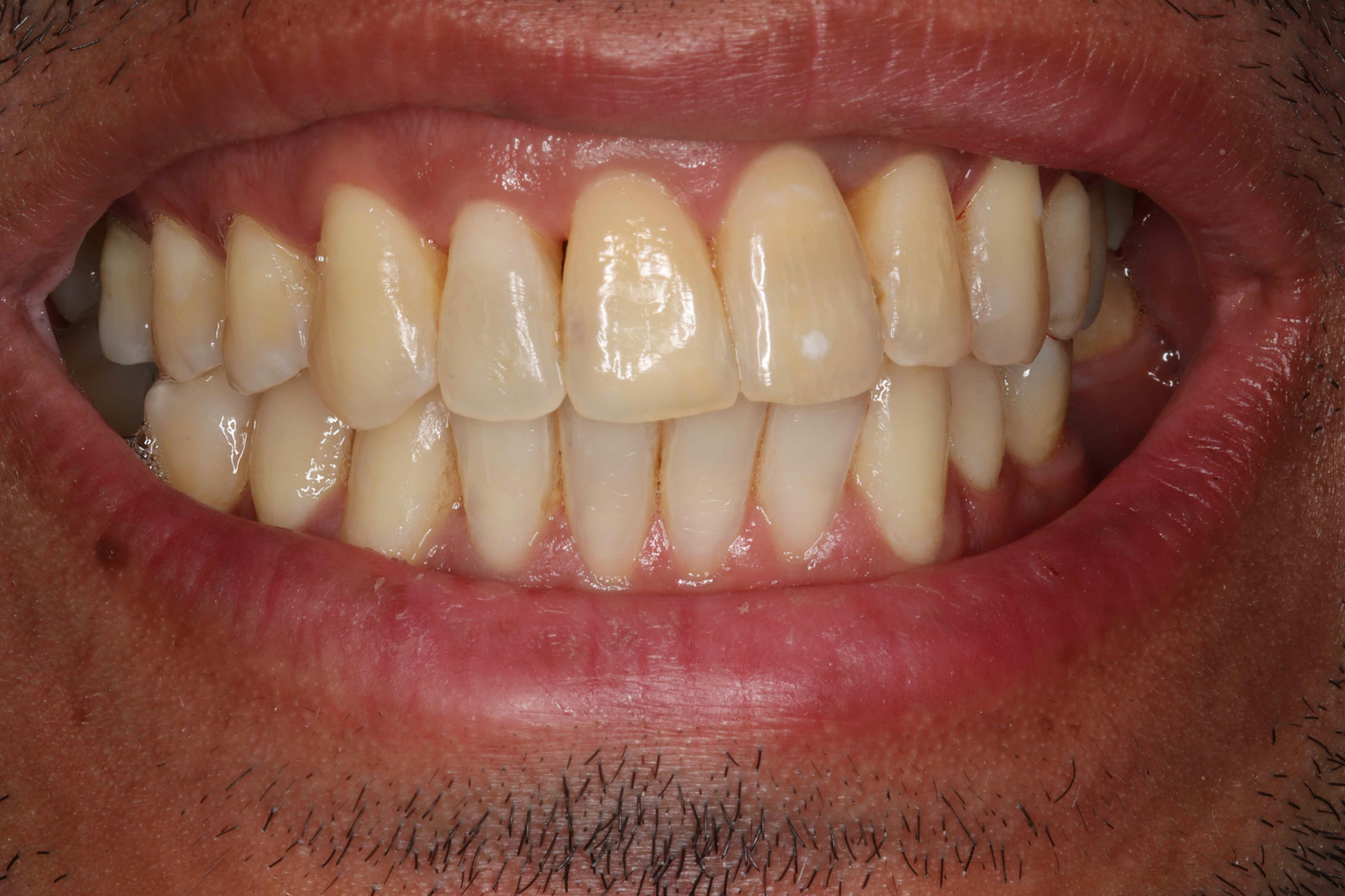 When we assessed Jhony's situation, a couple of things caught our eye. First, he had developed some noticeable gaps near his gumline, which we in the dental world call "black holes." Nobody wants those! We also noticed that his teeth weren't quite lining up with the midline of his face. It seemed like the orthodontic treatment had shifted his teeth a bit too far in one direction, causing them to lean sideways. On top of that, Jhony mentioned that after years of wearing braces, his teeth had gotten darker and more yellow. Not cool!